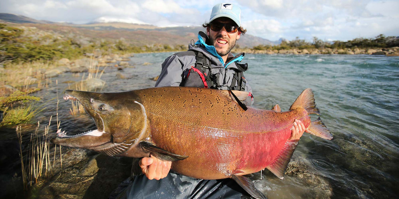 King salmon (Oncorhynchus tshawytscha), also known as Chinook salmon, is the largest species of Pacific salmon. These fish are known for their immense size, strength and fighting spirit, making them highly sought after by anglers. They can grow over 50 inches long and weigh more than 100 lbs, though most caught in rivers range between 10- and 50 lbs. Pacific salmon are anadromous, meaning they hatch in freshwater, migrate to the ocean and years later return to their freshwater birthplace to spawn. Their flesh varies in colour from deep red to pink or even white, depending on their diet and genetics. Though they are native to North America, king salmon were introduced to Patagonia where they have successfully established wild populations. One of the most remarkable locations to find them is the Rio Guanaco, a remote and pristine river offering anglers a unique fishing experience. Fly fishing for king salmon is an exciting challenge. These fish are powerful and landing one requires the right tackle, patience and skill.