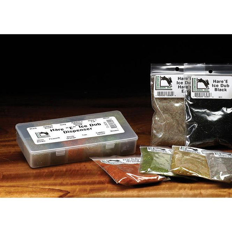 Hare'e Ice Dubbing Dispenser combines the natural spikiness of hare’s ear with the sparkle of Ice Dub in a handy multi-compartment box. Each blend gives you a buggy texture with internal flash, perfect for nymphs, emergers and attractor patterns. The dispenser design with small base holes lets you draw out a controlled pinch of dubbing without disturbing neighbouring colours.